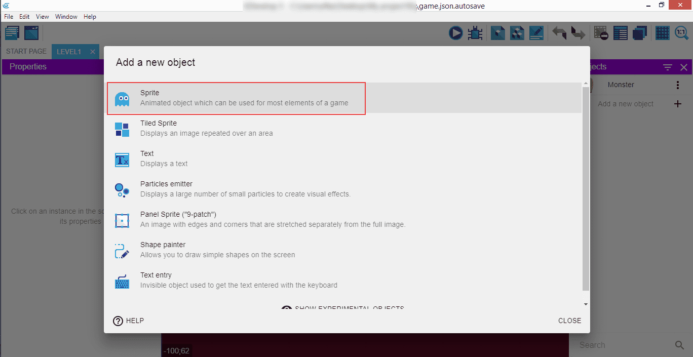 Select a "Sprite", like we did with the Monster before.