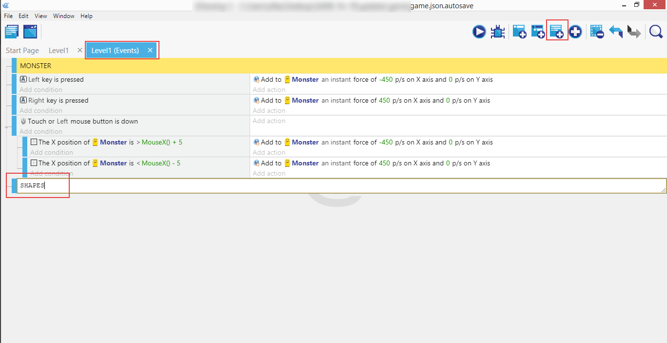 We're almost done with the shapes. Create a comment called "Move shapes", then click on "Add a new empty event", then "Add action".